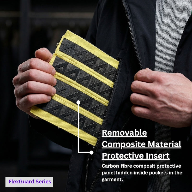 Hidden inside pockets are our proprietary carbon-fibre composite material panels, which are flexible and wrap around the torso without pronouncing their existence to the attacker.