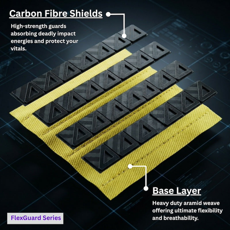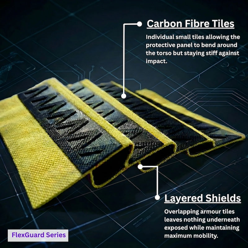 The patented design combines flexibility of aramid fabric and high-strength carbon-fibre scales. Bend, twist, and sit comfortably all day without the "stiff-board" feeling of traditional vests.
