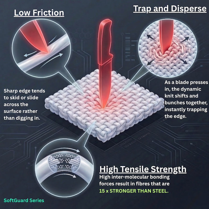 create a fiber 15x stronger than steel. This creates a "catch-and-blunt" effect against serrated edges and spikes.